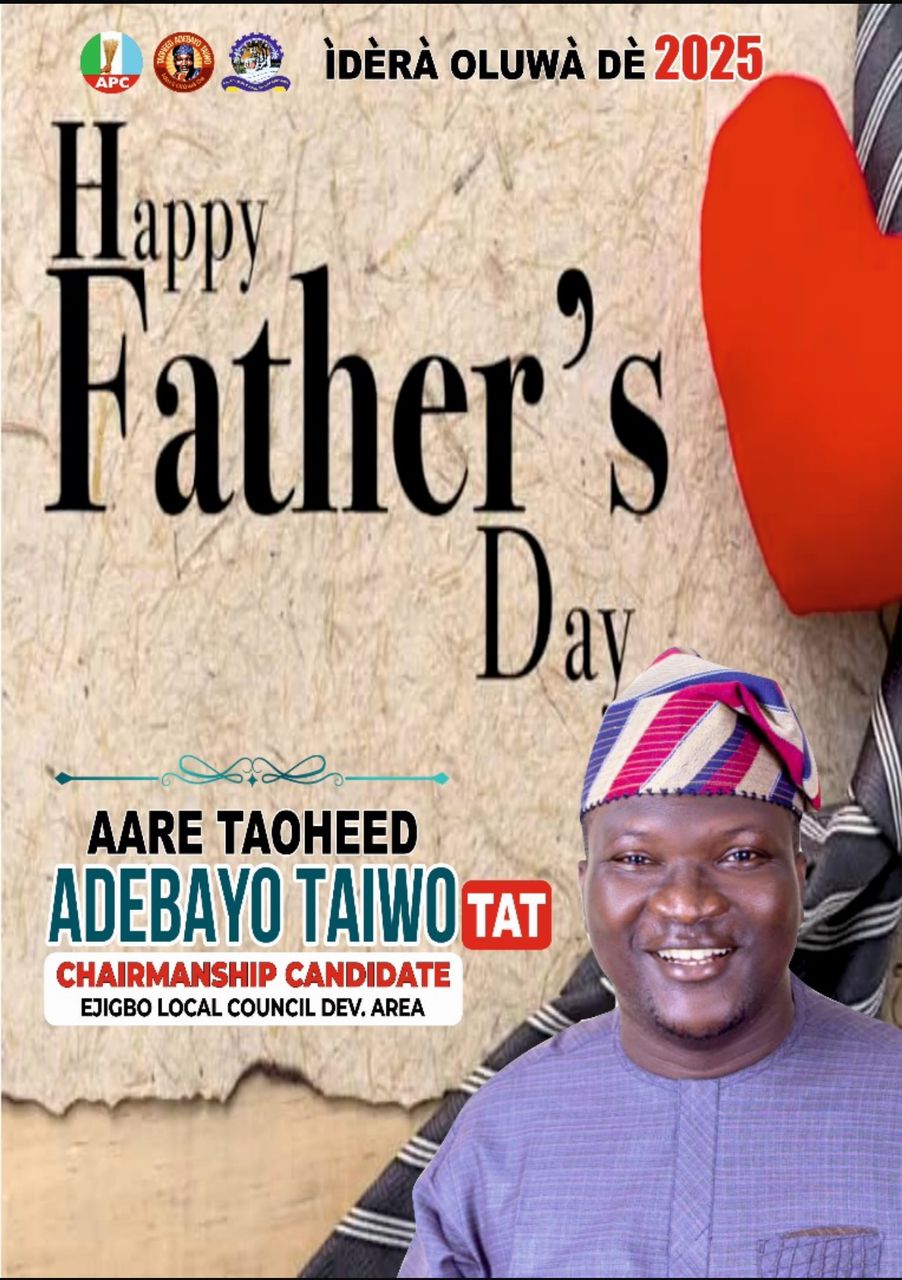 The All Progressive Congress Chairmanship Candidate for Ejigbo LCDA,Aare Taoheed Adebayo Taiwo (TAT),has extended a heartfelt appreciation to fathers and father figures in Ejigbo and beyond on this year’s Father’s Day celebration.