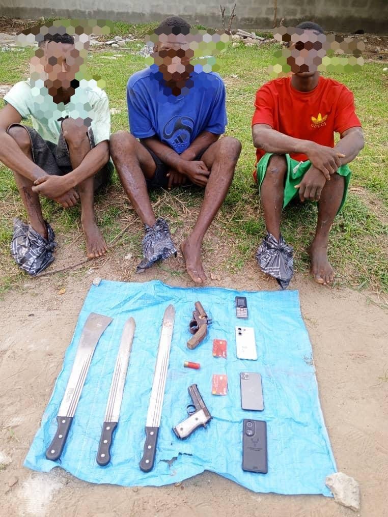 The special police squad deployed to Ughelli, Delta State by the Commissioner of Police,CP Abaniwonda Olufemi to checkmate the activities of Kidnapers and armed robbers in Ughelli,Warri Sapele and it environs successfully arrested three suspected armed robbers and recovered one beretta pistol, one locally cut-to-size gun, three cutlasses, phones and ATM cards belonging to victims.