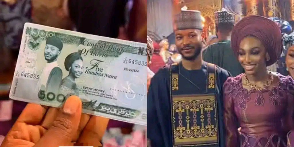 In the video captioned “CBN na your mate?”, the customized note, which features the faces of the bride and groom, was displayed, closely resembling the 200 naira Nigerian note.